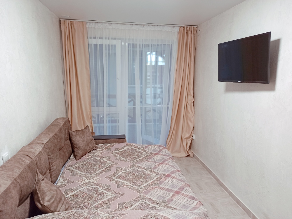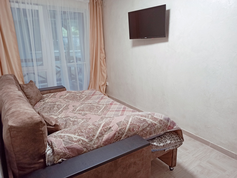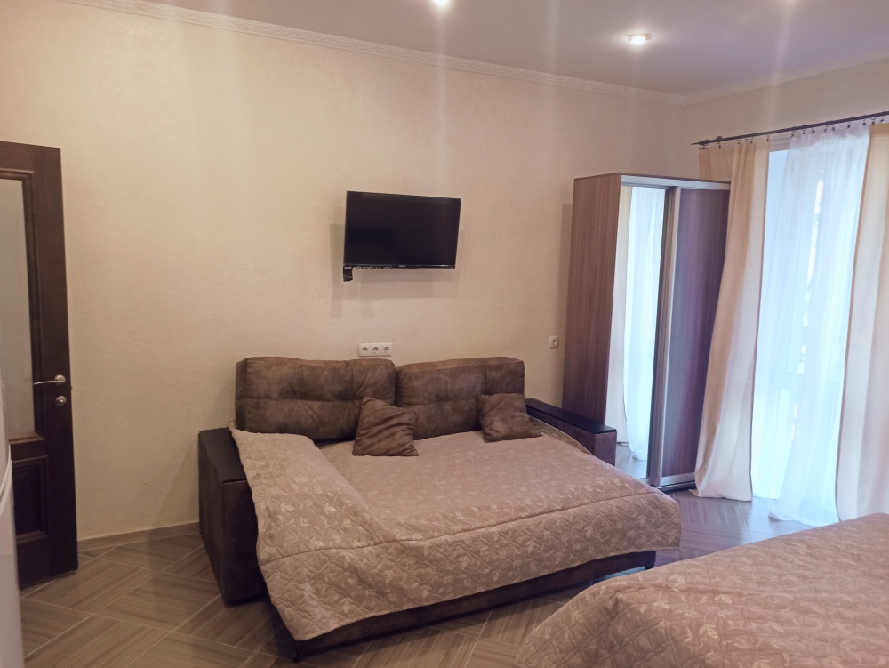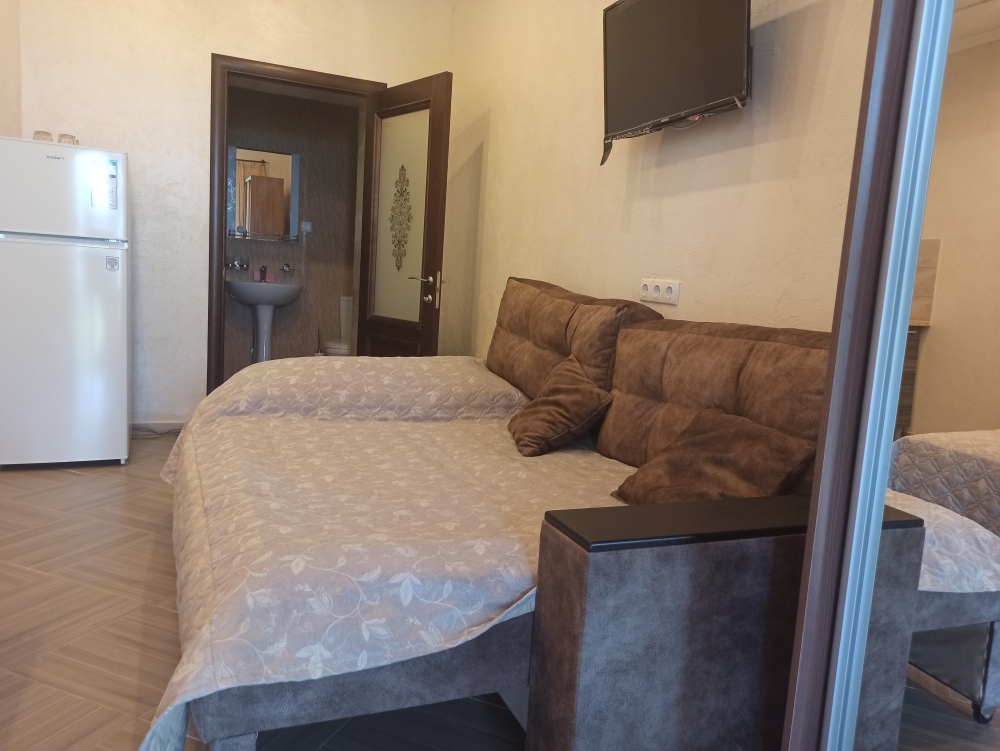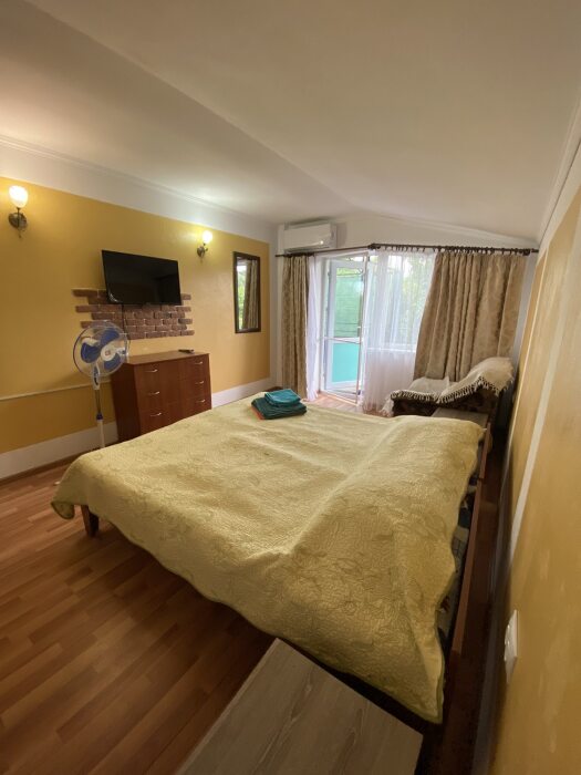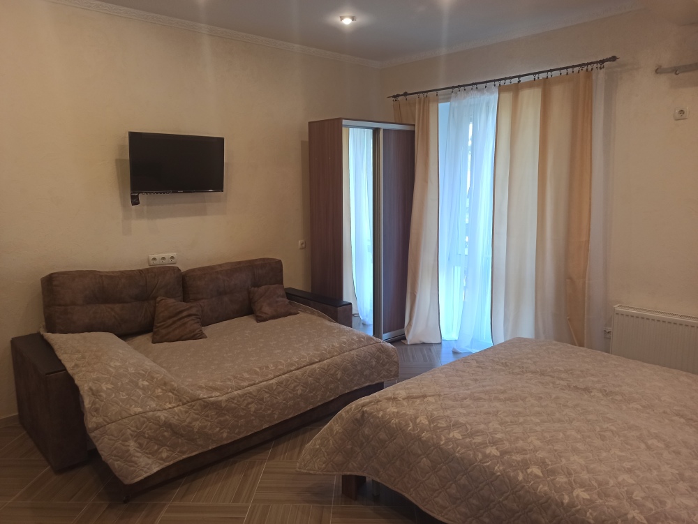 Мини-гостиница располагает 10-ю комфортабельными чистыми номерами с балконом класса люкс с удобствами внутри, оснащенными необходимой мебелью и кондиционером. Комнаты рассчитаны на 3 места + одно дополнительное по необходимости. Основным достоинством номеров мини-гостиницы- изумительный вид на море и вулкан Кара-Даг. До пляжа 5-7 минут ходьбы.