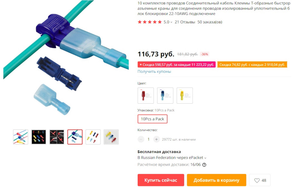 Так же согласно схемы подключения для МКПП требуется отбор сигнала от педали сцепления. Тут на ум ничего не приходит, кроме применения вот такой или подобной муфты скотчлока родом из всё того же Китая. Она обеспечивает изоляцию контакта присоединения в период, когда круиз может быть снят. Я применил похожую муфту что у меня имелась в запасе. По размеру — брать красную: Сечение провода на педали 0.75мм^2. Допустимые сечения красной фишки 0.5-1.5мм^2.
