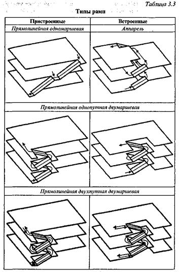 Пристроенные рампы обеспечивают быстрое заполнение (освобождение) помещений и исключают транзитное движение по этажам. Однако обособленные рампы увеличивают площадь застройки.