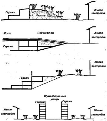 Известно, что наземные многоэтажные автостоянки могут иметь дополнительное назначение – служить в качестве экрана, препятствующего проникновению шума в глубь застройки. это могут быть некоторые магистрали, городские дороги, предназначенные для грузового транспорта и проезда легковых автомобилей на большие расстояния, транзитом (рис. 3.22, г).