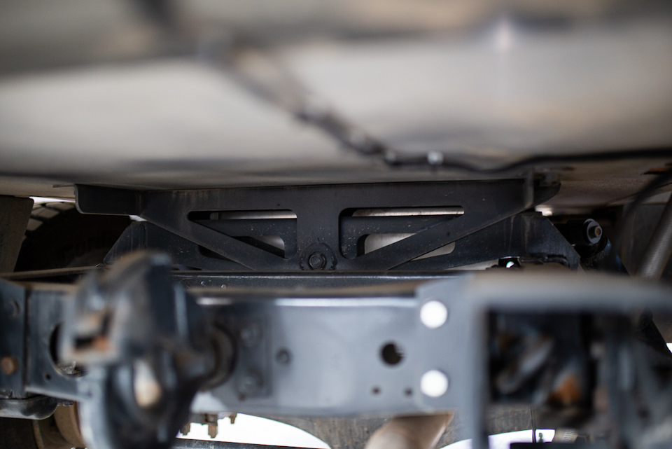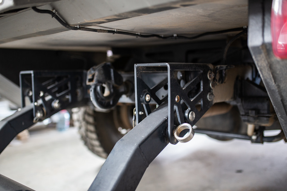 Сам корпус жилого модуля отвязан от рамы и расположен с помощью вот такого «плавающего» крепления. Это позволяет на бездорожье раме свободно скручиваться, при этом не ломая домик. И сам домик тоже не связывает жестко раму и не ломает в свою очередь её. Насколько я знаю, большие автодома все строятся по такому принципу.