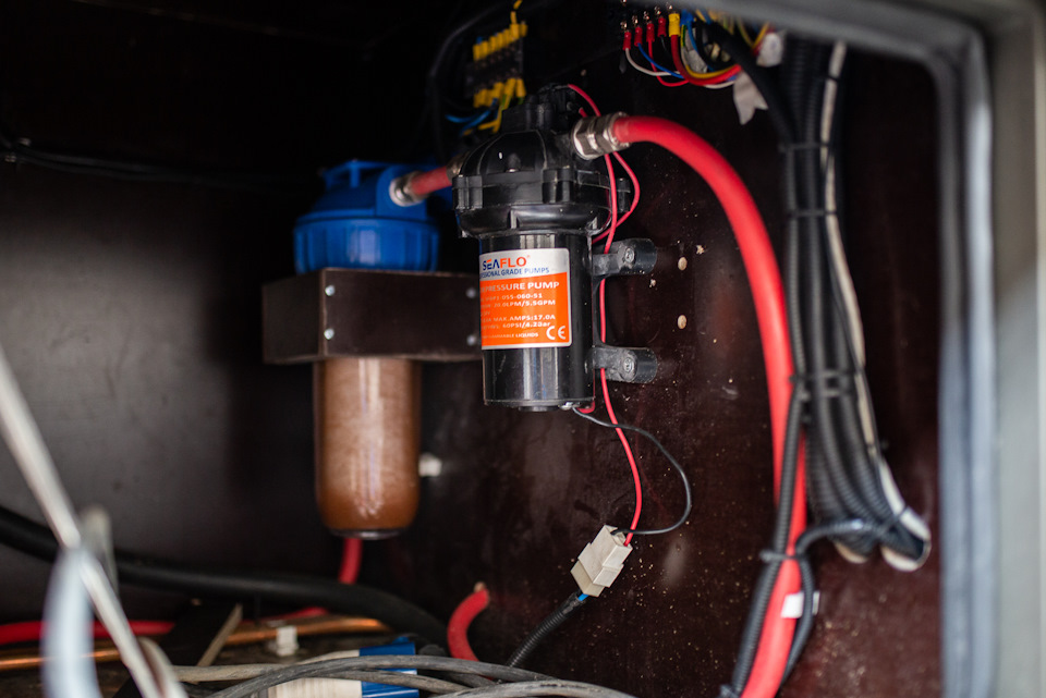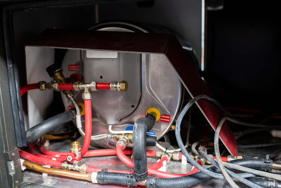 Отопление и подогрев воды тут сделаны довольно интересно. За всю систему отвечает 9 кВт жидкостной отопитель, который греет воду для душа/раковины и теплоноситель для отопления жилого отсека. В домике проложены водяные полы и стоит обычная радиаторная батарея. Эффективность, говорят, умопомрачительная.