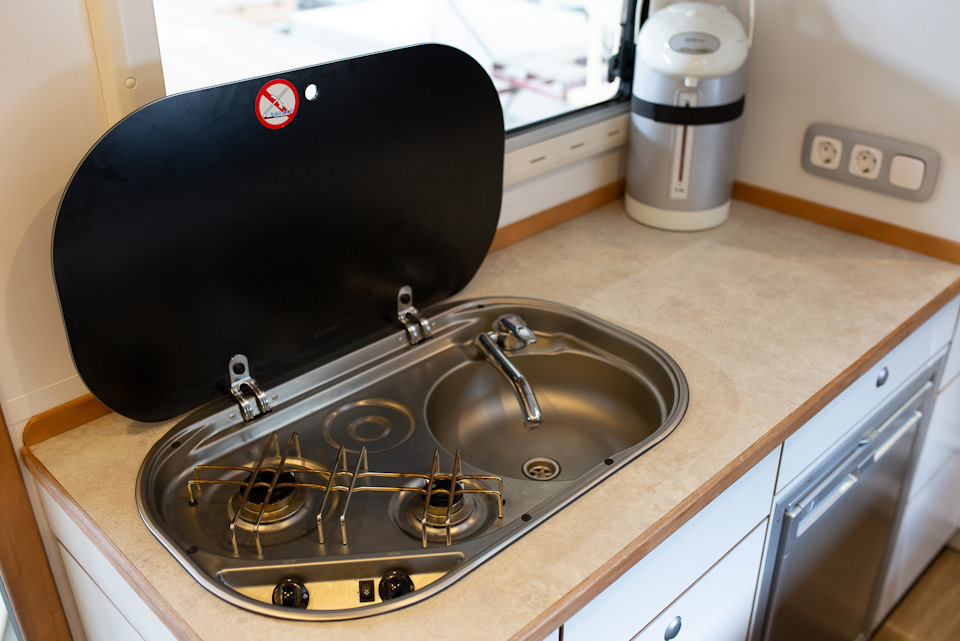 Рабочая поверхность очень просторна за счет компактного сочетания двухконфорочной варочной панели и мойки. Защитная крышка из термостойкого стекла в закрытом положении обеспечивает дополнительную рабочую поверхность.