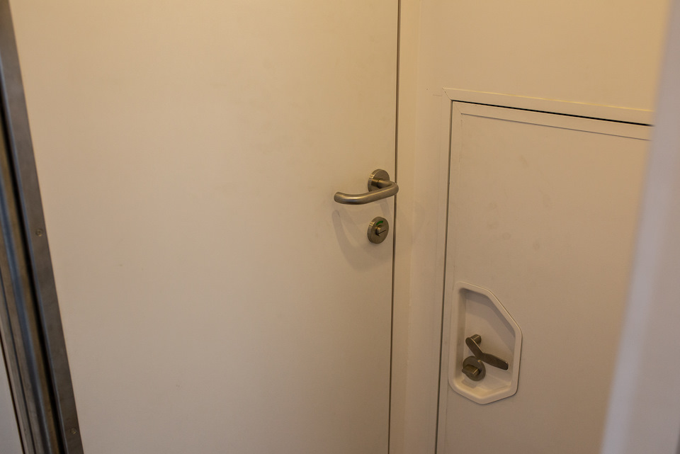Ну и о «главном». На фото мы видим две двери — одна ведёт в туалет, а вторая в кабину. В туалет это обычная классическая полноразмерная дверь, а в кабину примерно половинка от неё.