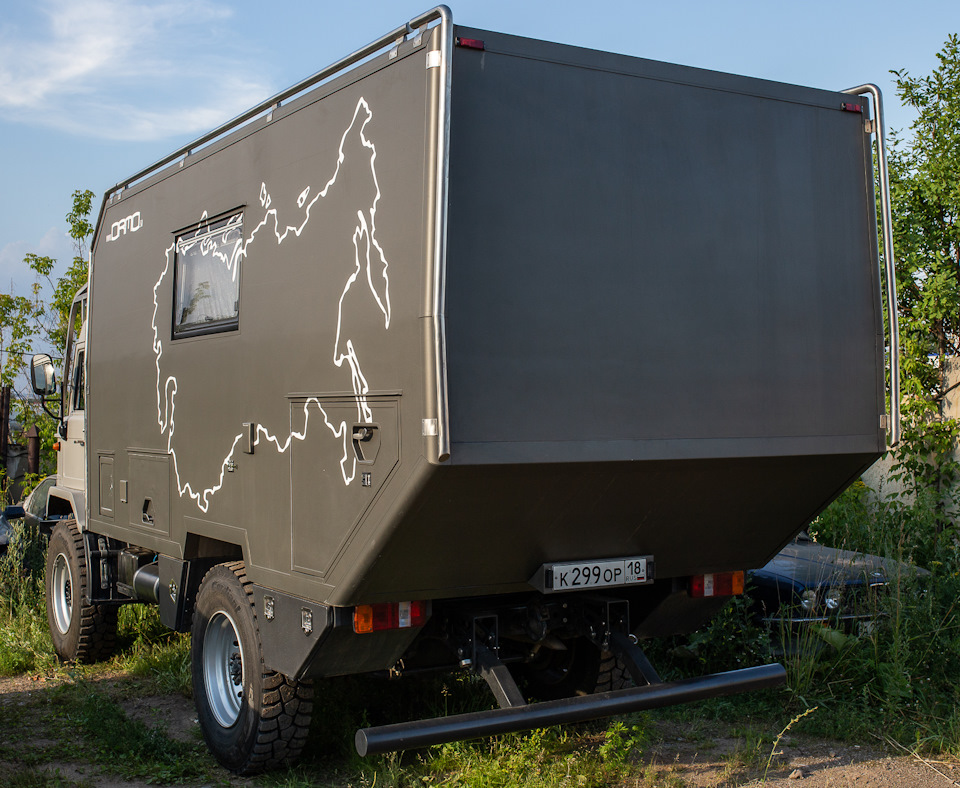 Брутальный серый кузов, собранный из сэндвич-панелей, установлен на базе ГАЗ 66