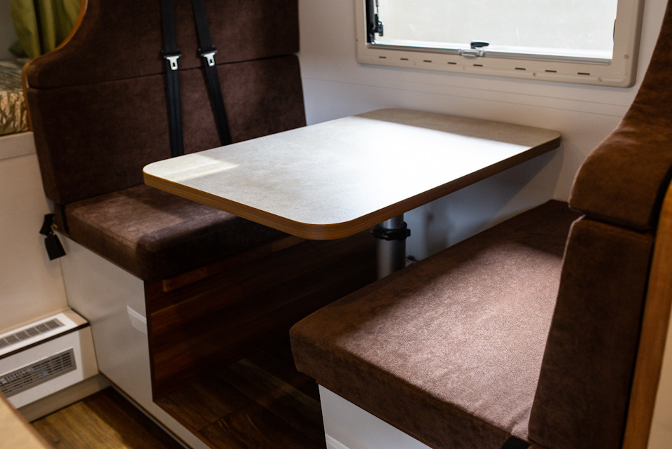 Всего в модуле комфортно может расположиться четыре человека. Два дополнительных спальных места обеспечивает складная конструкция обеденного стола, где в роли матраса выступают боковые съемные подушки.
