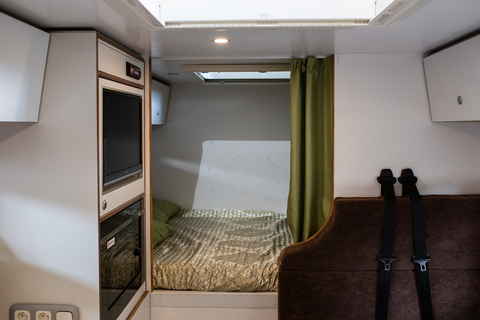 Спальное место можно зашторить, если кто-то вдруг собрался спать пока все остальные за столом. Но на практике такое редко бывает, скорее это способ отделиться от «гостевого дивана», который получается из складывающегося стола и сидений.