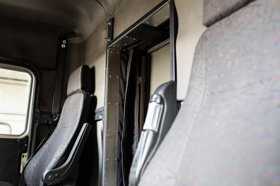 В кабине установлены сиденья с пневмоподвесом, что, судя по всему, является неким стандартом для такого рода техники. И организован переход в жилой отсек посредством подвижного сочленения типа «гармошка». На самом деле это не проход, а больше перелаз, но я потом покажу это подробнее.