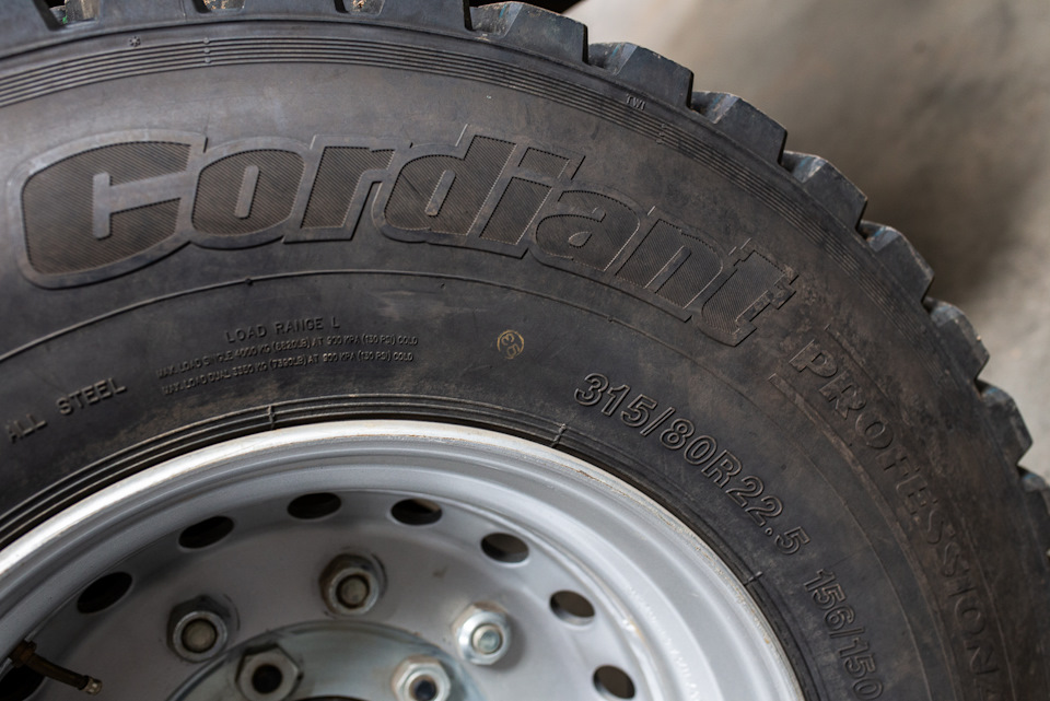 На автомобиле установлены шины размерностью 315/80 R22.5, что в переводе на дюймовый размер, если я не ошибаюсь, конечно, с калькулятором, будет 41,8″