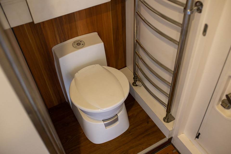 Довольно крупный и удобный туалет Dometic. У него есть и свой собственный резервуар и подключен он к сточному баку для серых вод.