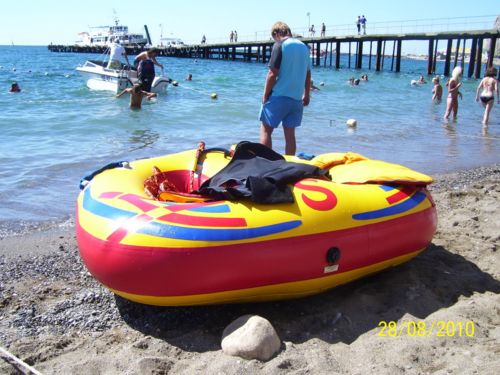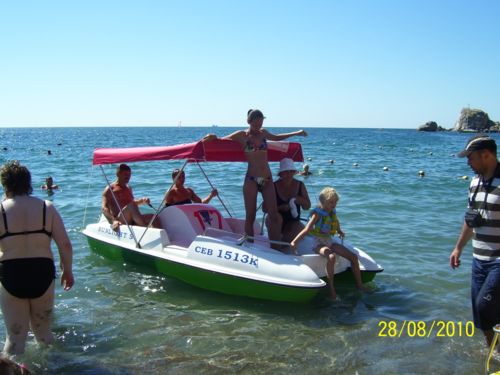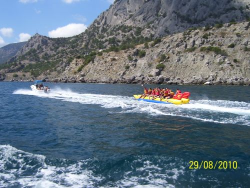 Получасовая прогулка на «банане» - 50, «таблетка» - 70 грн., водный велосипед (катамаран) – 70-100 в час. Парашют – 320.