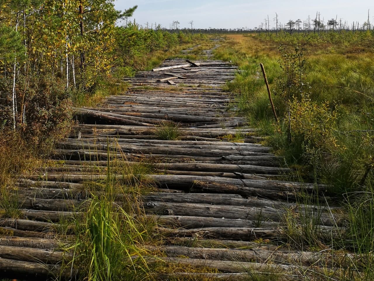 Эта дорога очень длинная и идет к озерам, до которых можно дойти минут за 30. Озер много, и они очень красивые – оттуда болото видно до горизонта. А еще осенью клюква вдоль тропы растет тоннами: многие туда приезжают именно за ней.