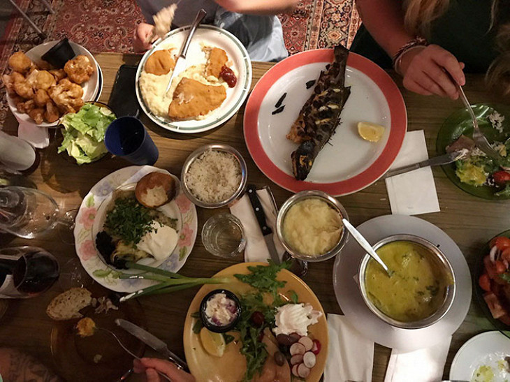 Обед из горячего блюда, 20-ти мини закусок и графина лимонада обошелся в 120 шекелей с человека (примерно 34 доллара).
