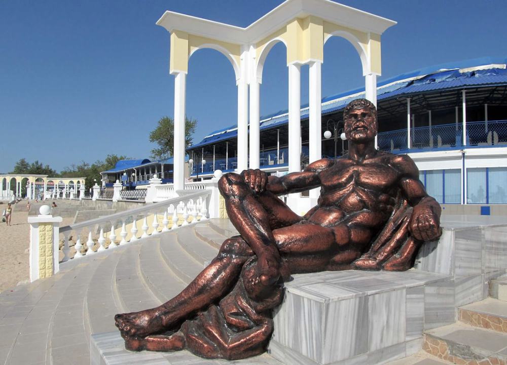 Отдыхающий Геракл – скульптура в городе Евпатория, Крым. В те далёкие времена, когда Крым ещё принадлежал грекам и одним из его названий было Таврида (к слову, после присоединения к России в 1783 году, он назывался так же), здесь по преданиям отдыхал главный герой древнегреческих мифов и легенд Геракл (хотя грамотнее его всё-таки звать Геркулес). На месте нынешнего города Евпатория, в античности существовал город Керкинитида, где очень почитали внебрачного сына Зевса.