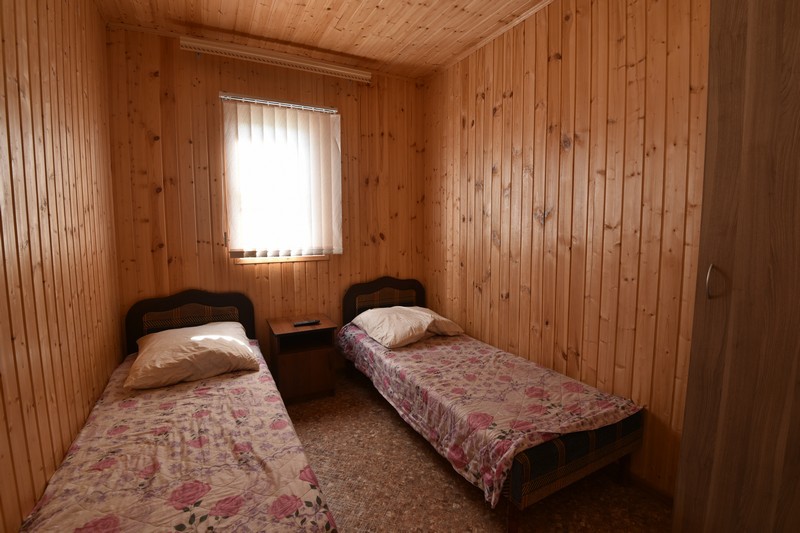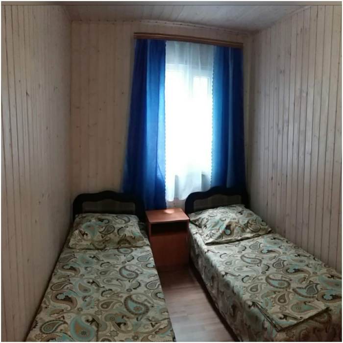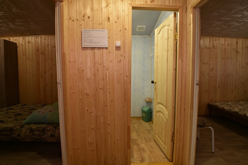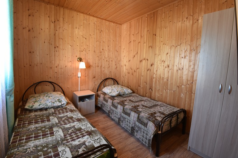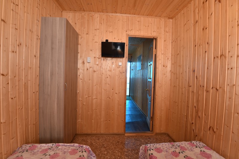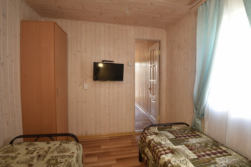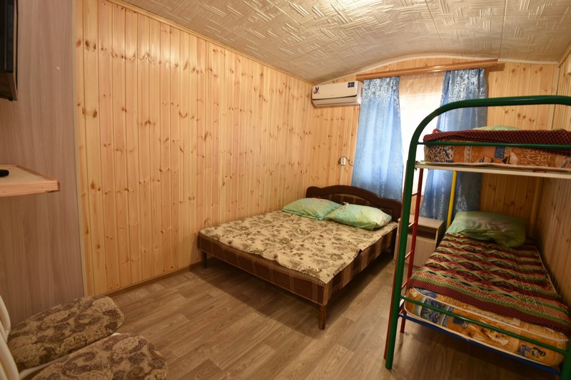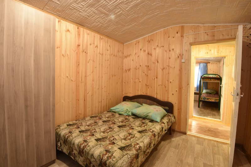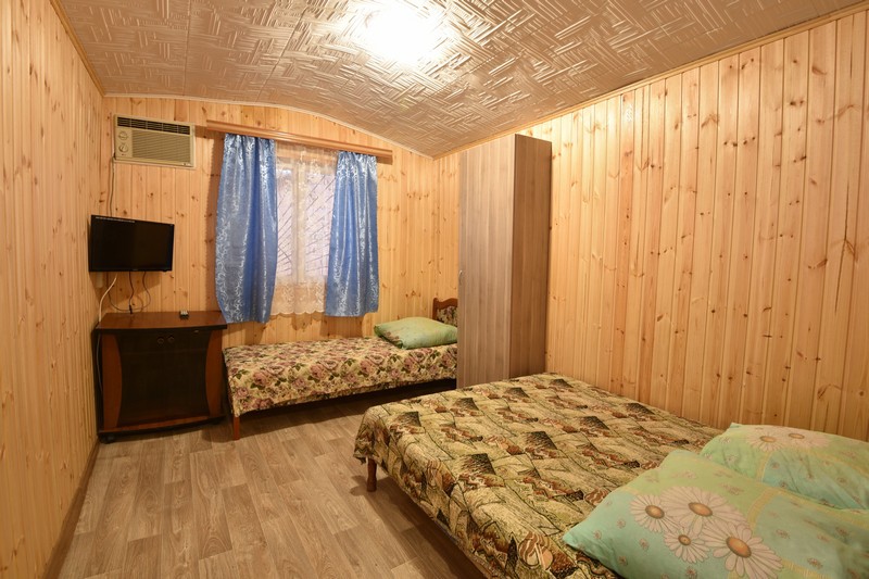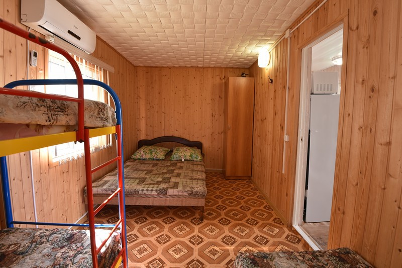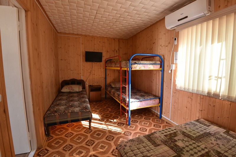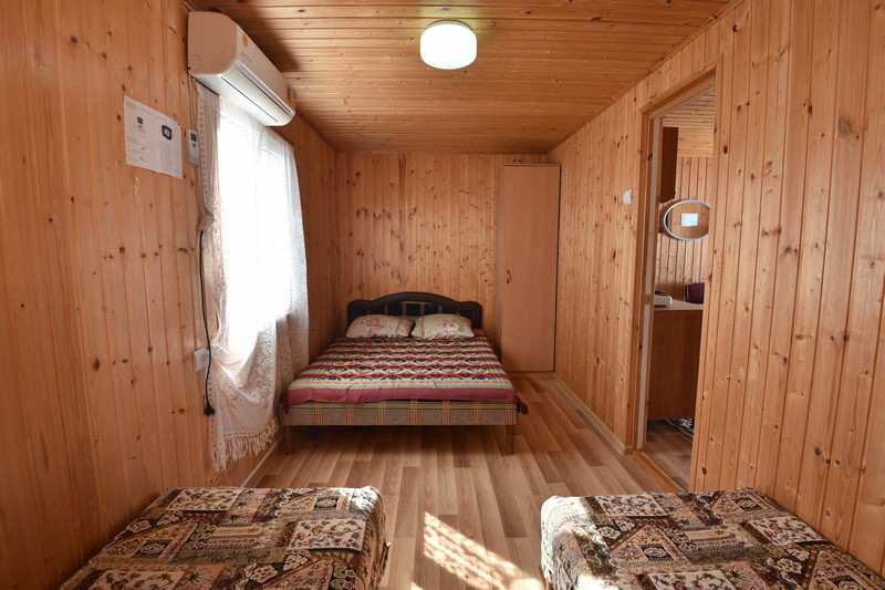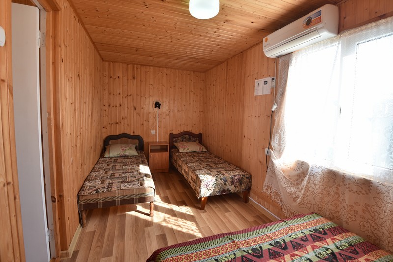 В домике три номера: один большой однокомнатный номер на 1 этаже (четырехместный) и два номера на 2 этаже: однокомнатный трехместный и двухкомнатный четырехместный.
