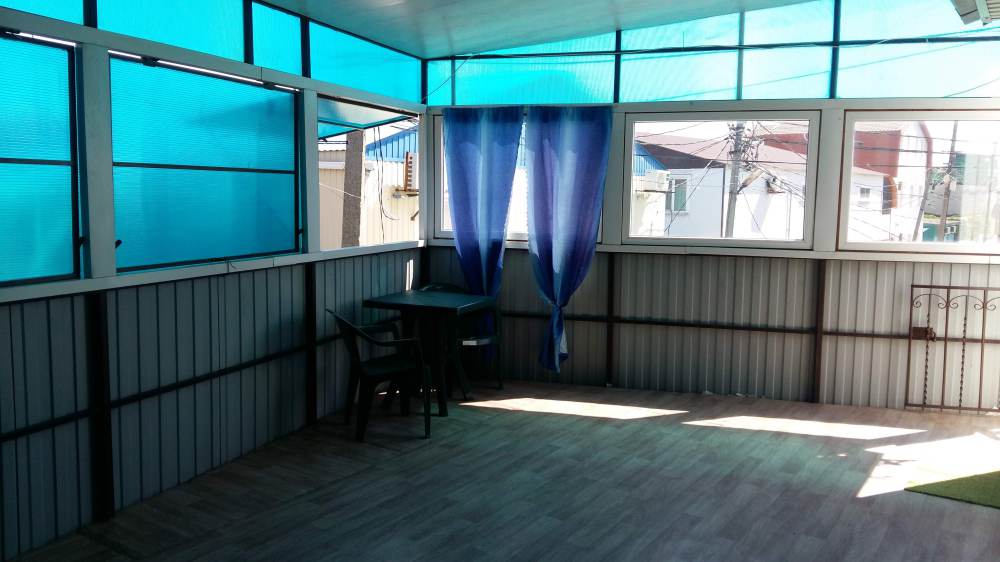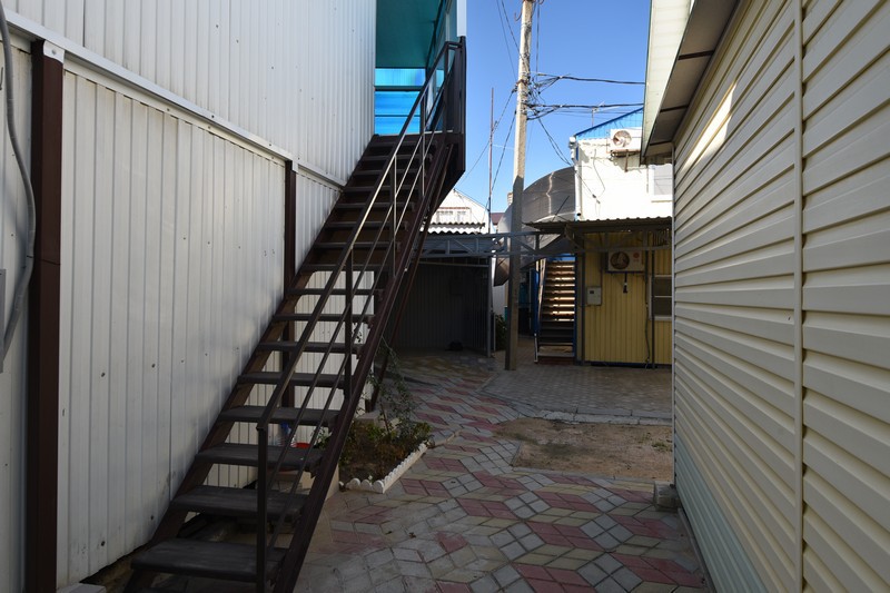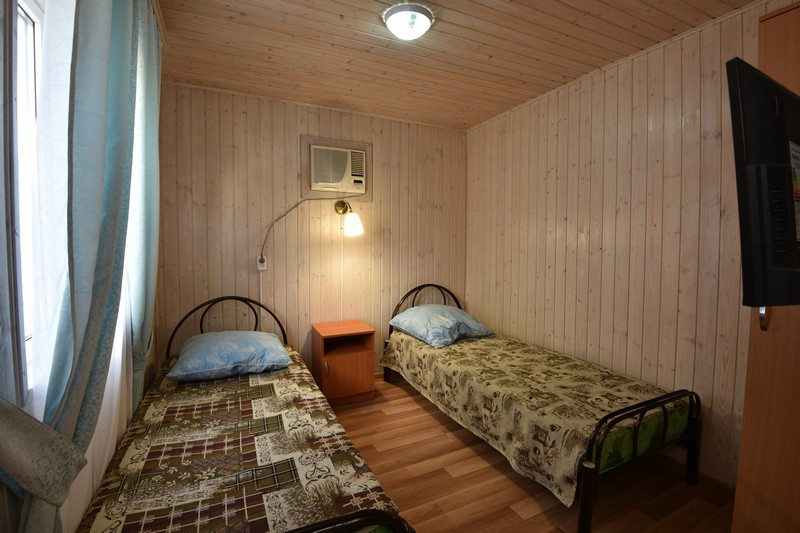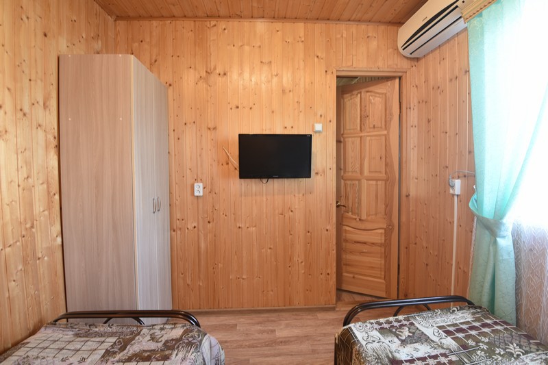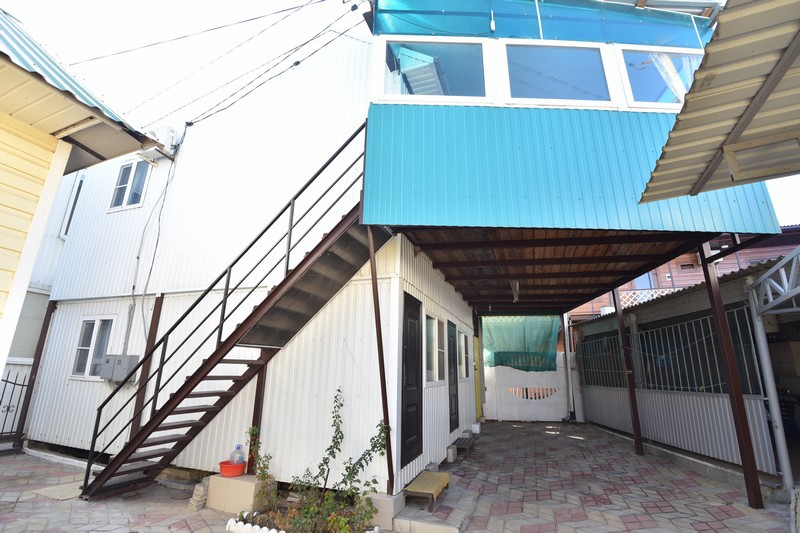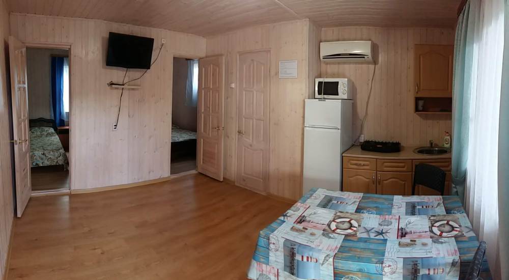 В домике сдаются номера с отдельными входами с территории или с общего балкона. В каждом номере есть собственная кухня, две непроходные спальные комнаты, установлена сплит-система, есть санузел с душем . У входа каждого номера есть немного места, где можно поставить стол со стульями, не мешая никому из соседей. Номера рассчитаны на отдых четырех человек.