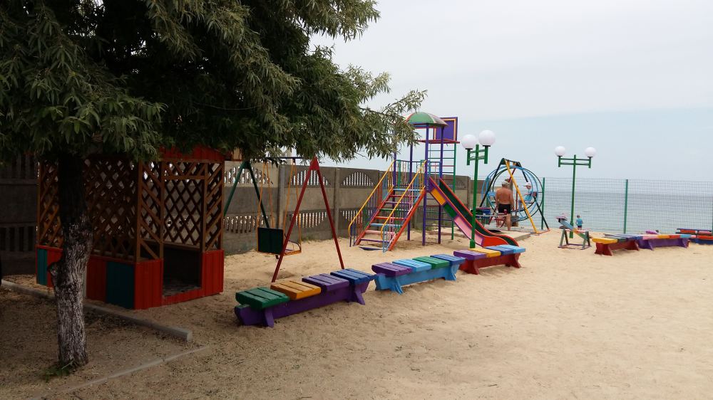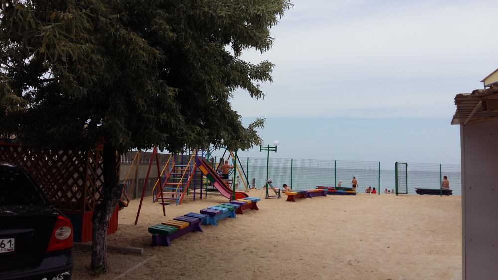 Домик находится на базе отдыха «Отдых» в районе голубицкого аквапарка. База находится на первой линии от пляжа, поэтому до моря менее сотни метров. Рядом аквапарк, кафе, магазины, торговые лари. Недалеко дельфинарий, колесо обозрения и прочие развлечения.