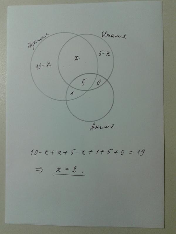Нам известно, что во всех трех странах было 5 сотрудников. В Англии и Италии тоже 5, значит эти же сотрудники были и во Франции и поэтому в пересечении кругов А и И ставим 0. В Франции и Италии нам неизвестно поэтому пишем х-5 в пересечении кругов А и Ф. Т.к. в Англии было 6 человек, то 6-5-1=0 пишем 0,во Франции 16-х+5-6 и Италии 10-х+5-5 и всего в фирме 19 сотрудников, то остается составить и решить уравнение: