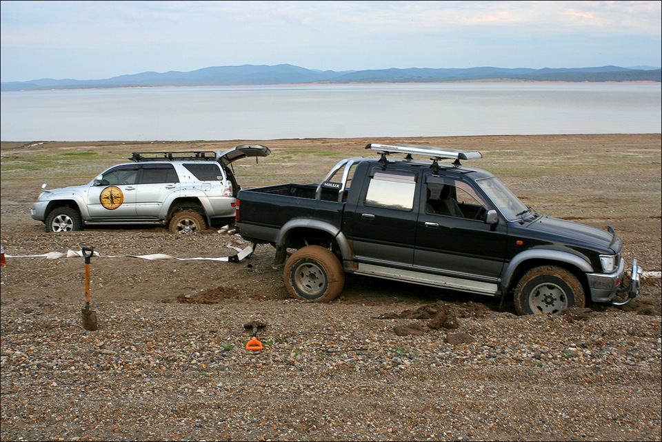 Однако, удача была на нашей стороне, ещё когда мы ехали по берегу, за одним мыском мы проехали отдыхающую компанию на четырех машинах, среди которых я сразу приметил пикапчика-собрата Хайлюкса… к которому я и потопал…