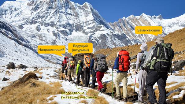 Каждый участник обязан наблюдать за состоянием товарищей, оказывать помощь (например, брать на себя часть груза) и самостоятельно докладывать руководителю о своих наблюдениях.