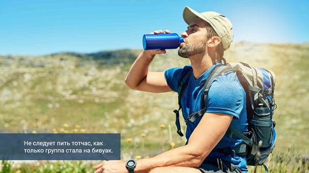 На обеденном привале тоже не надо сразу набрасываться на воду. Лучше всего подождать, пока будет готов чай, компот или что-нибудь в этом роде. Если ждать очень долго, то, во всяком случае, не следует пить тотчас, как только группа стала на бивуак. Турист ещё разгорячён ходьбой и выпьет гораздо больше воды, чем ему на самом деле нужно. И ещё: никогда не надо пить залпом, без отрыва. Лучше пить маленькими глотками, словно пробуя вкус напитка. Прежде чем проглотить воду, нужно прополоскать ею рот. Между глотками нужно делать небольшие паузы. Если пить не торопясь, то можно утолить жажду совсем небольшим количеством воды.