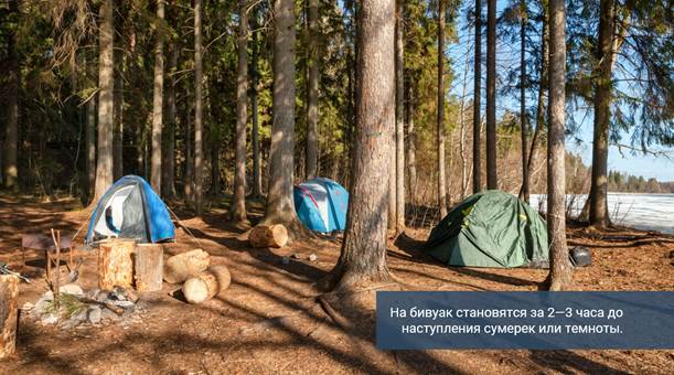 Разбивать вечерний бивуак летом надо засветло. Лучше раньше встать, чем позднее лечь, так как света и прохлады в утренние часы больше.