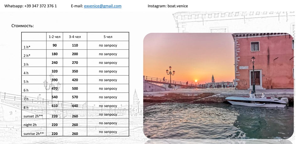 Предлагаем несколько вариантов прогулки по каналам Венеции. Цены представлены за одного человека или за лодку. Здесь же есть экскурсия на историческую верфь Сан-Тровазо.