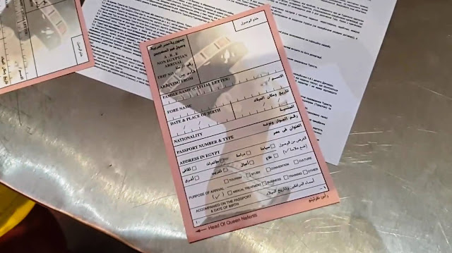 Далее автобусами доставили в терминал аэропорта, после чего - прохождение границы Египта. Перед паспортным контролем берем у гида миграционную карту. Вот образец заполнения.