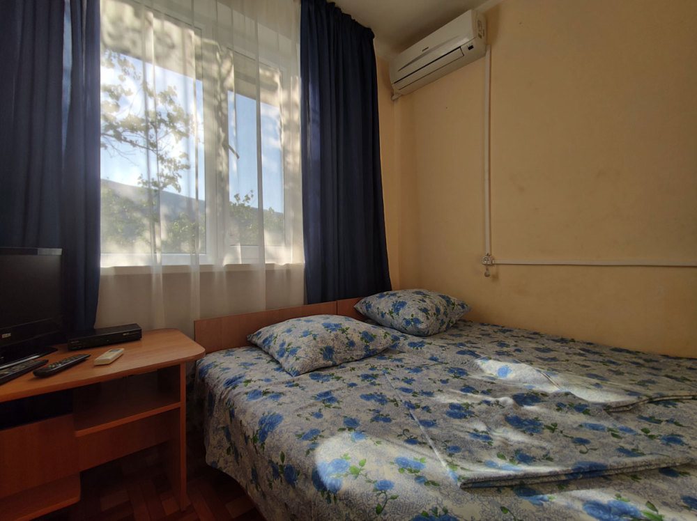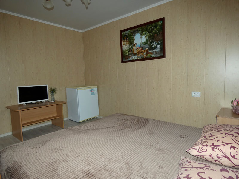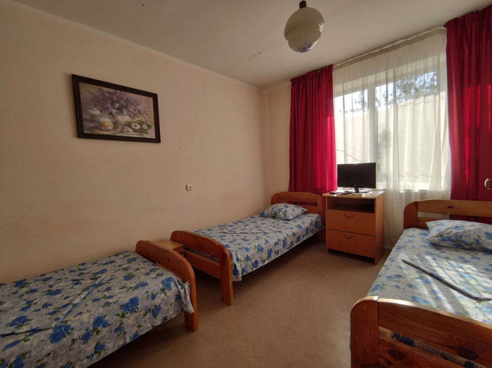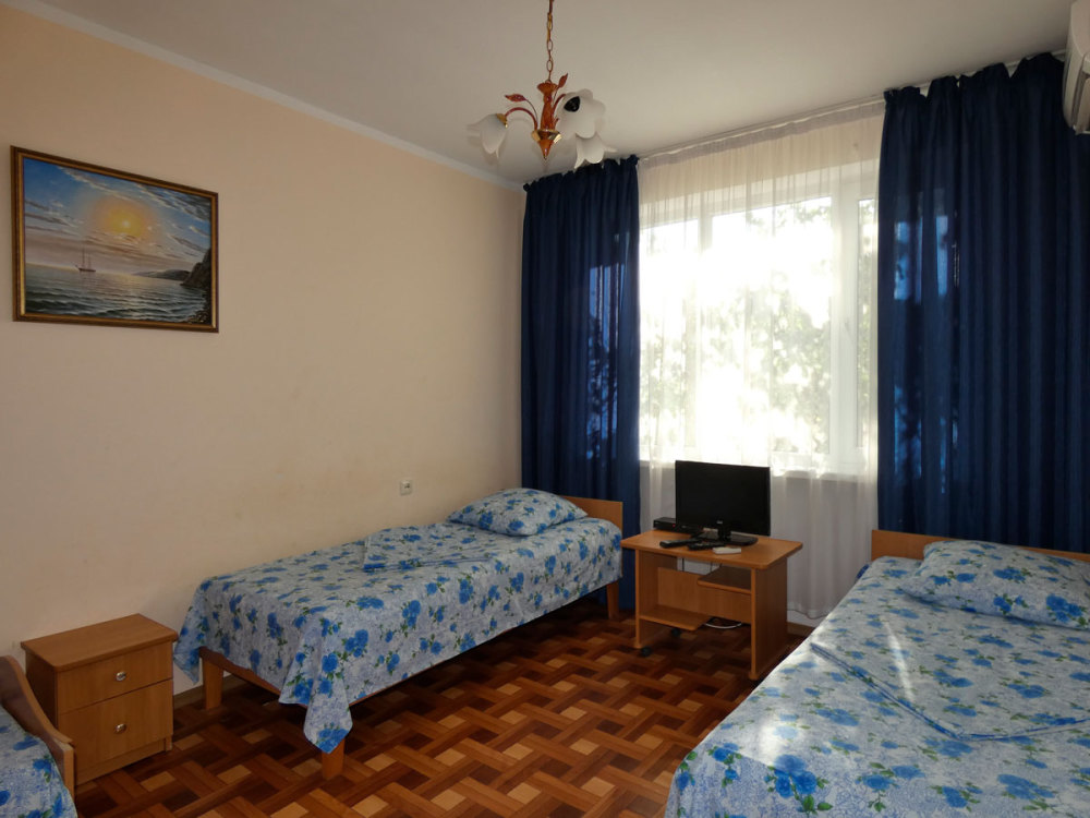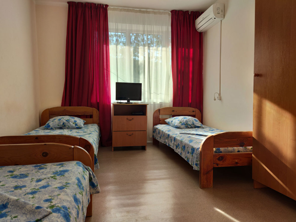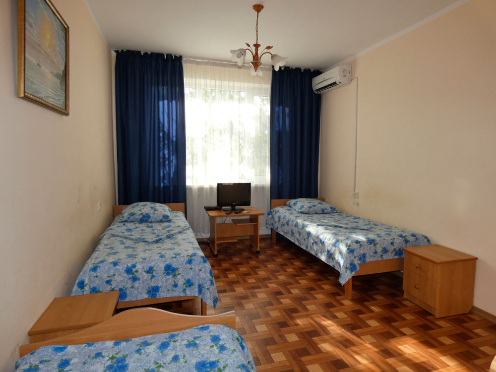 Номера категории "Трёхместный стандарт", расположены в коттеджах №6, 34 (по старому обозначению № 5 и Гостиница №31). Расстояние до пляжа около 230 -270 метров. Спальная комната – три односпальные кровати, две из них составлены вместе или порознь и раскладной диванчик (Полноценное спальное место). Все номера укомплектованы прикроватными тумбочками, столиками, кондиционером, TV, холодильником, минимальным (очень минимальным) набором столовой посуды. В номерах есть санузел (душ, умывальник, туалет, горячая и холодная вода постоянно). Видео номера, Вы можете посмотреть кликнув на превью видео расположенного ниже текста и блока фотографий.