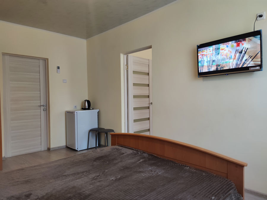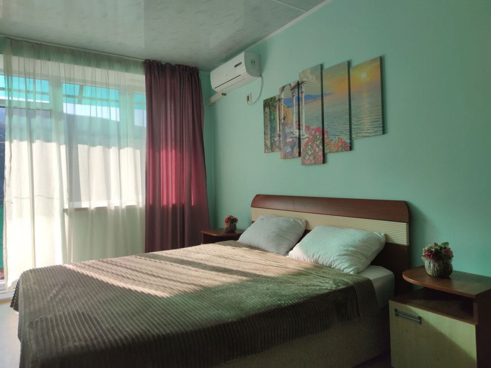 Удобства: двухспальная кровать, мягкий уголок, ТВ, кондиционер, варочная плита и имеется необходимый набор столовой и кухонной посуды, сейф, выход на балкон.