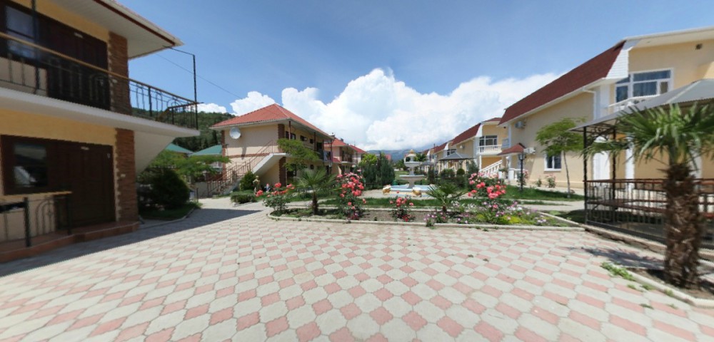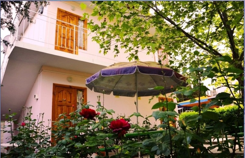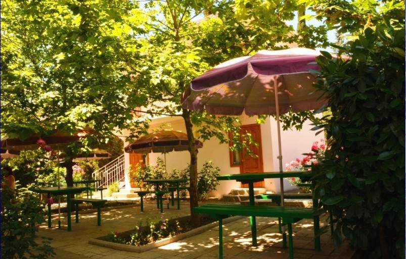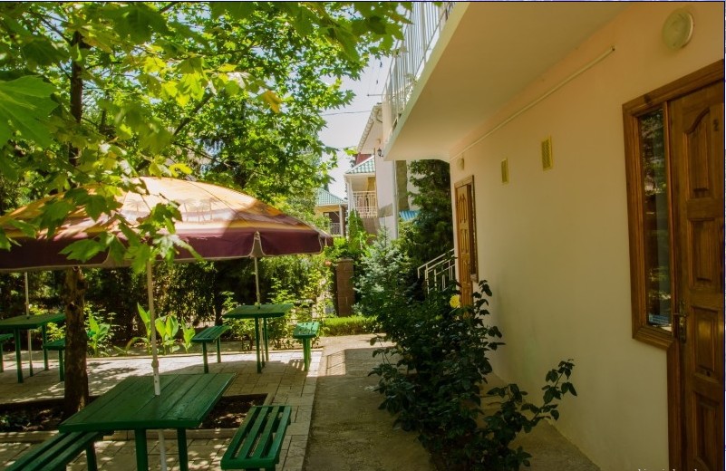В пансионате имеется собственный дворик со столиками в тени платанов и лужайкой. Территория засажена кипарисами, пальмами, кустами лавровишни, розмарина и туи, а так же розами и различными цветами.