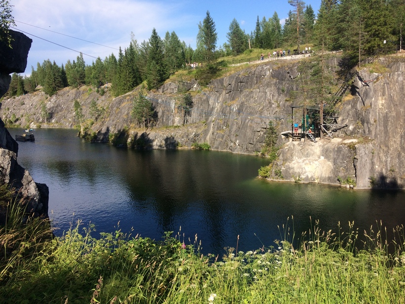 В получасе езды находится мраморный каньон Рускеала (вход — 450 руб.). Вокруг озера есть смотровые площадки, а вечером у скал включается подсветка, что создаёт атмосферу сказки.