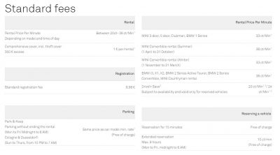Стоимость минуты поездки составляет 24-34 цента. Оператор работает на территории нескольких крупных городов Германии, в числе которых Мюнхен, Берлин, Франкфурт. За час аренды необходимо оплатить около 14 евро, за сутки – 79 евро.