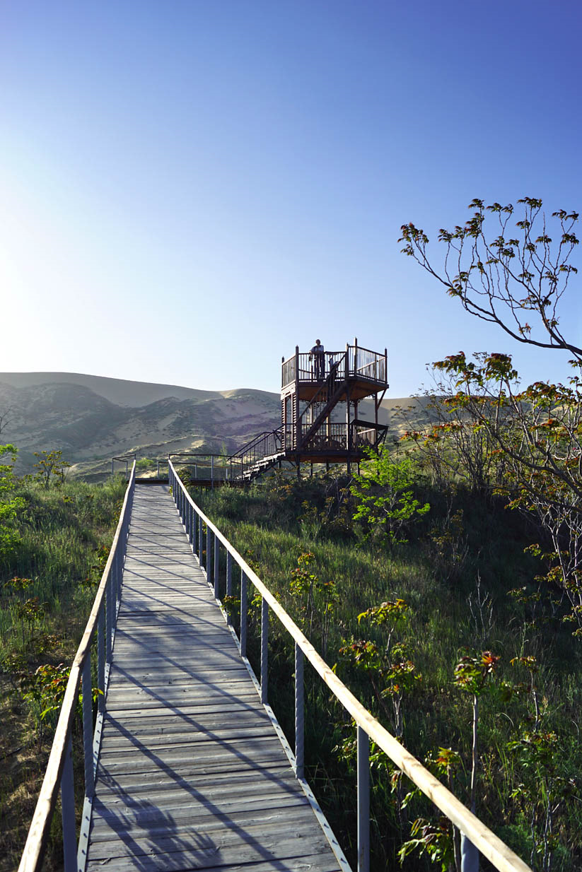 На высоте, где заканчивается тропа, находится смотровая площадка – настоящая Сахара! Ветер, раскалённый песок, ни одного растения, солнце… И потрясные виды на хребет Нарат-Тюбе. Сходить с тропы нельзя, но если прям очень хочется, то охранник не возражает. К чему эти условности, если взрослые бородатые дядьки, как дети, босиком готовы носиться, падать, вставать и снова бегать по жёлтому морю песка, визжа и смеясь от удовольствия!