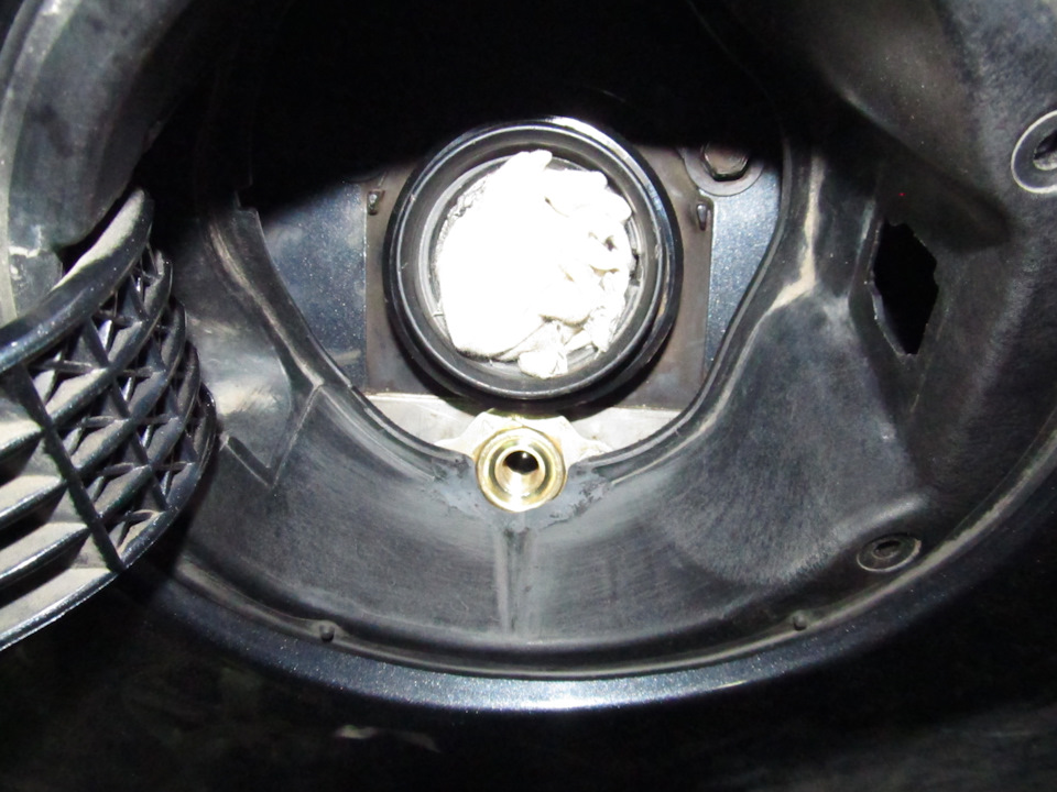 Снимаем резиновый уплотнитель заливной горловины. На фото уже демонтирован. Просто отверткой поддеваем с краев и по всему периметру стягиваем уплотнитель.