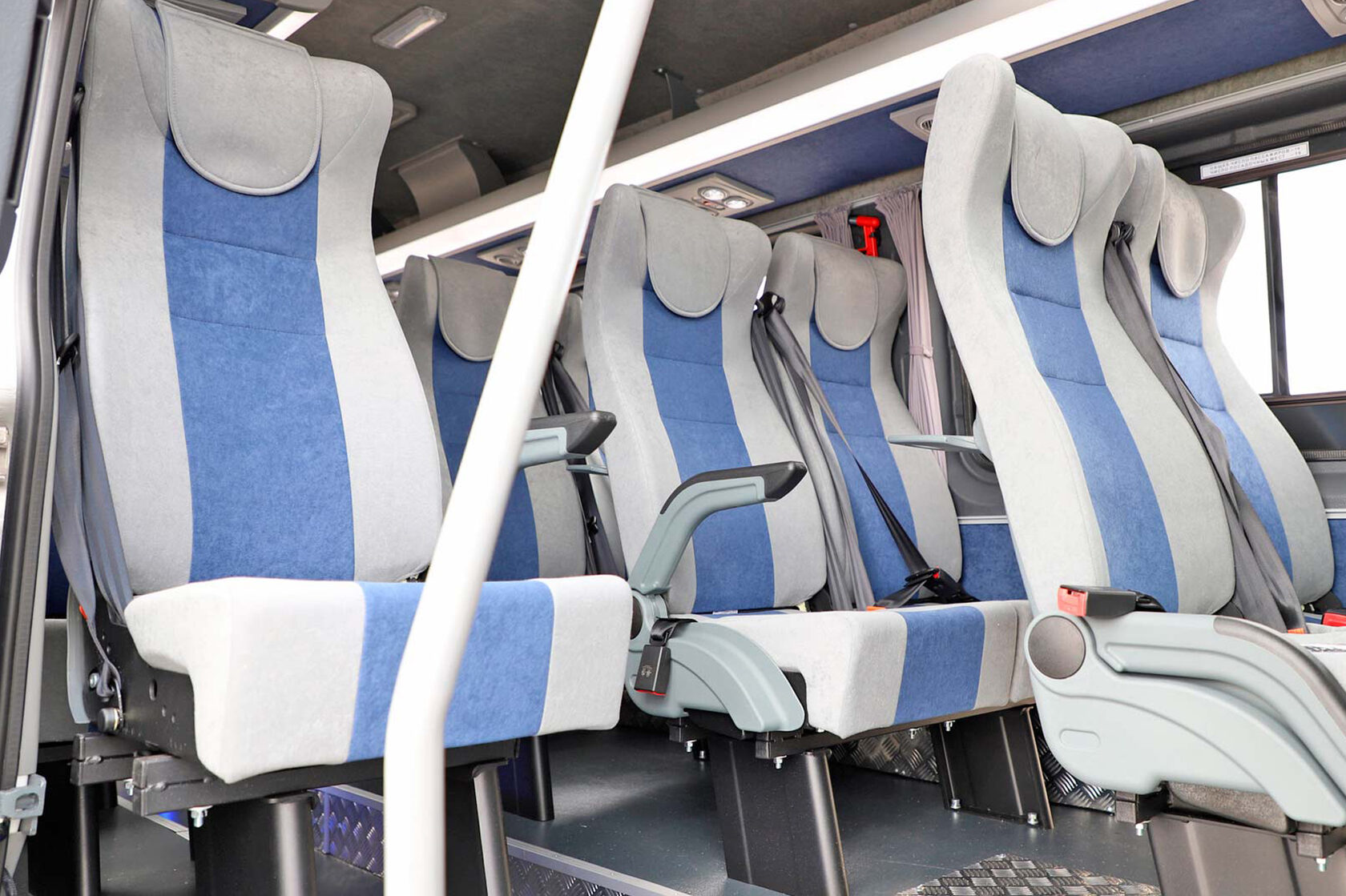 Анатомические сиденья «Турист T1N» с обивкой из замши или ткани в различных комбинациях с 2- или 3-точечными ремнями безопасности и подлокотниками со стороны прохода