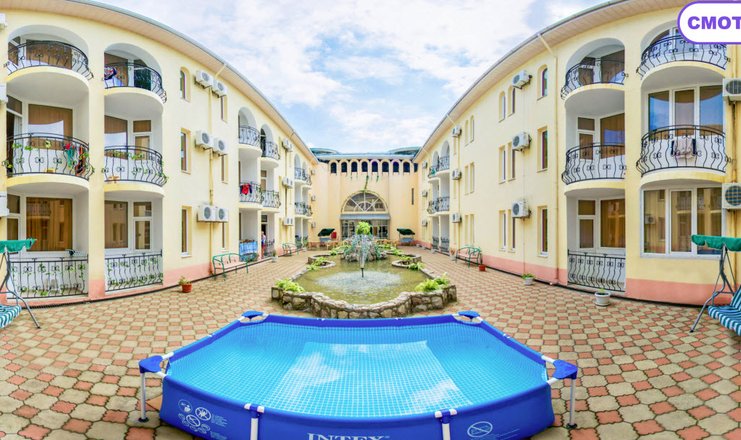 Гостиница «Олимп» находится в центре поселка Лазаревское, в трех минутах ходьбы от пляжа. Фасад здания построен в духе эпохи возрождения. Внутри дворика, окруженного отелем расположен пруд.