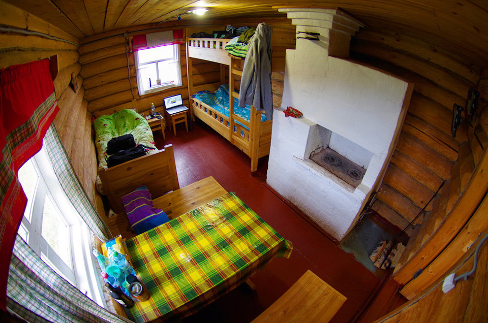 Внутри 2 кровати на 3 места, печка, стол, посуда, в общем все для самостоятельного приготовления еды. Печку топишь сам. Дрова лежат на улице, колоть дрова тоже надо самому.