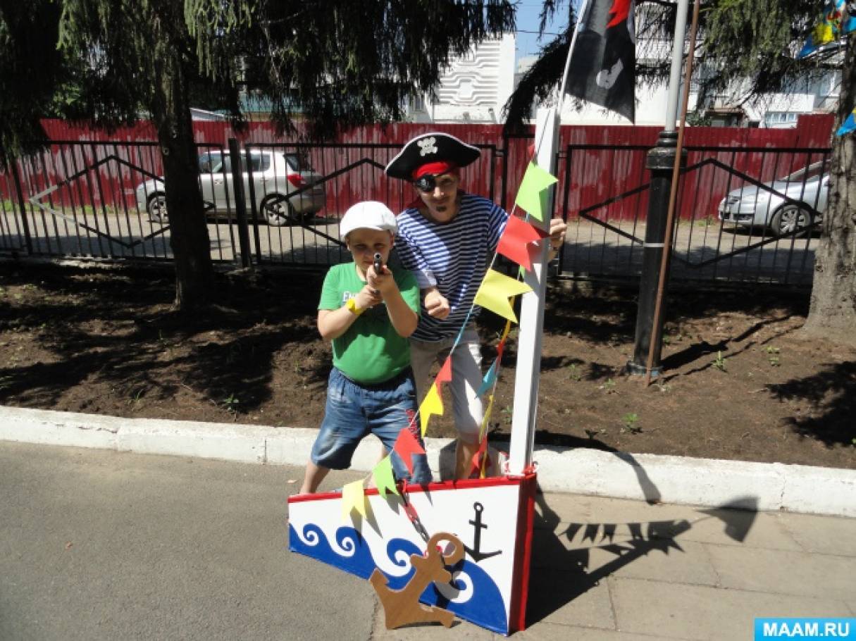 В роле Пирата еще я побывала на развлечении, организованном для детей старшей группы. Мой персонаж в сговоре захватил морского царя Нептуна. Но когда увидел какие смелые, отважные, быстрые, ловкие и веселые дети спасают царя, проходя сложные испытания, раскаялся и подружился с ребятами и Нептуном.