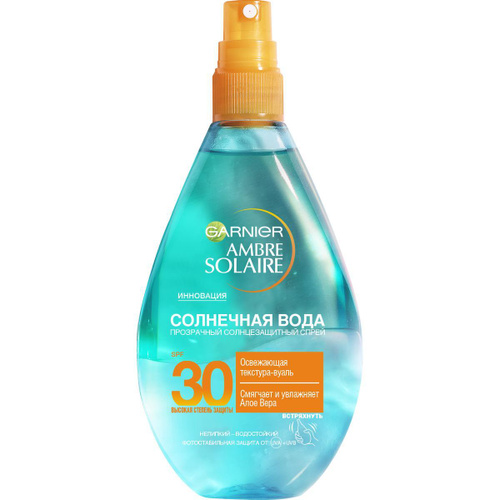 40 баллов с Premium Бестселлер Garnier Освежающий солнцезащитный спрей Ambre Solaire, Солнечная вода с алоэ вера, SPF 30, 150 мл