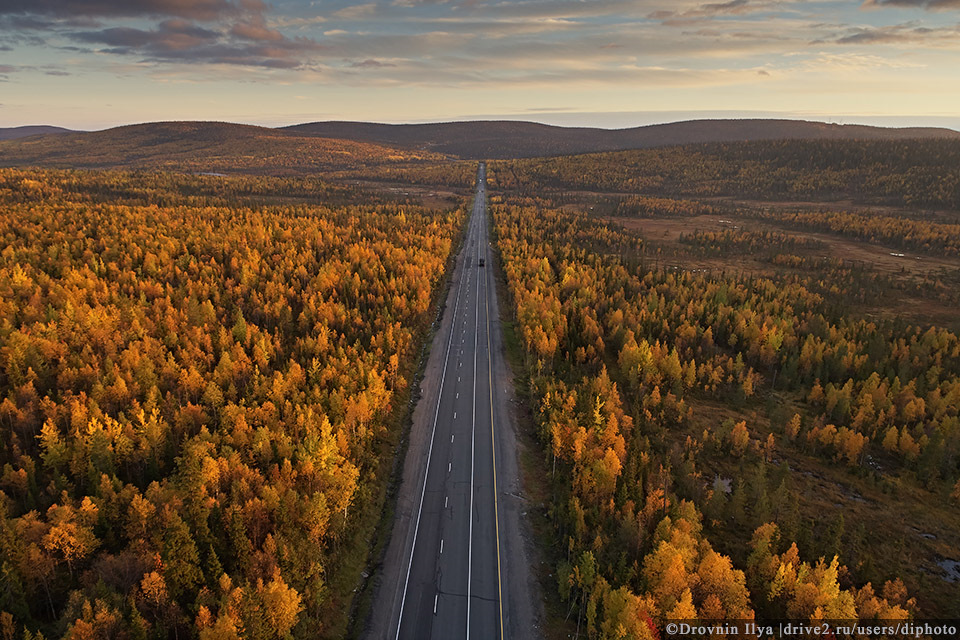 01.Путь на Кольский предстоит по единственной трассе «Кола». Сама дорога очень красива, и как только переезжаем за полярный круг природа меняется, а леса становятся огненными. Да-да, мы попали в самый расцвет золотой осени.