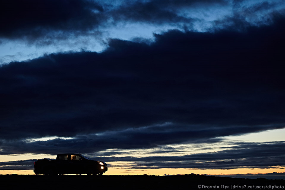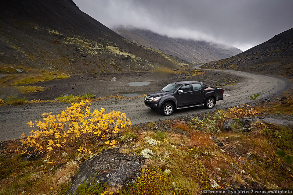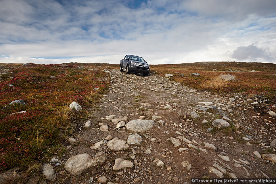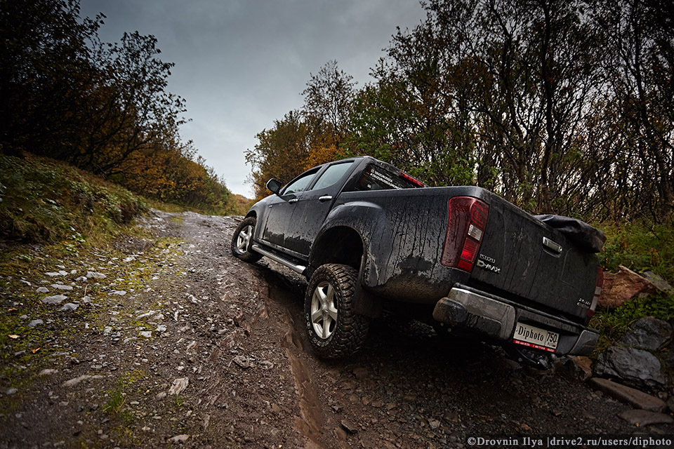 06.Передвигались мы на пикапе Isuzu D-max. Это почти идеальная машина для Кольского. Дизель очень тяговитый, полный привод, пониженная передача, большой клиренс, просторный салон и главное кузов, где катались два велика с вещами. Машина простая, утилитарная и очень честная, как в старые добрые времена, когда проектировали инженеры, а не маркетологи.