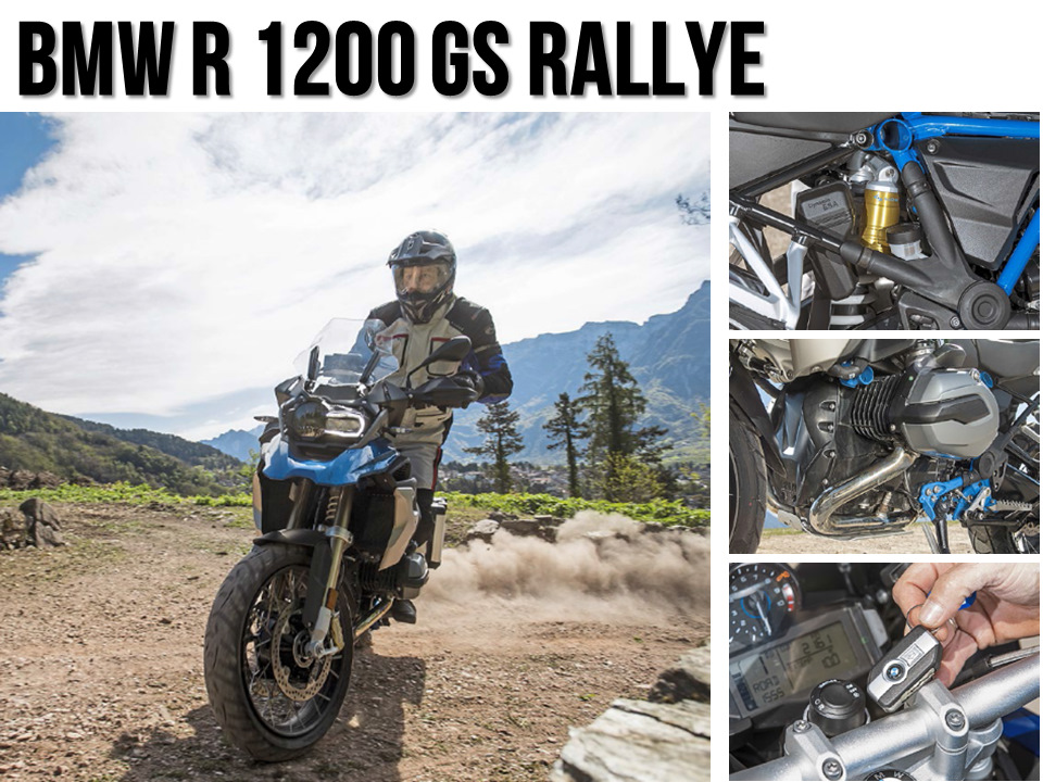В 2017 BMW несколько подвинула в сторону свои базовые GS и GS Adventure запустив Rallye – третий, промежуточный вариант пригодный к дорогам любого класса. Основа Rallye — это обычный GS. От Adventure заимствованы колеса с дизайном «перекрещенные спицы», зубастые подножки, выбор разных вариантов шин и, за дополнительную плату в 1090 евро, спортивная подвеска с увеличенными на 2 см ходами. Для улучшения управляемости баварцы также отказалась от огромного 30-литрового бака от Adventure и поставили его 20-литрового собрата от стандартного GS.