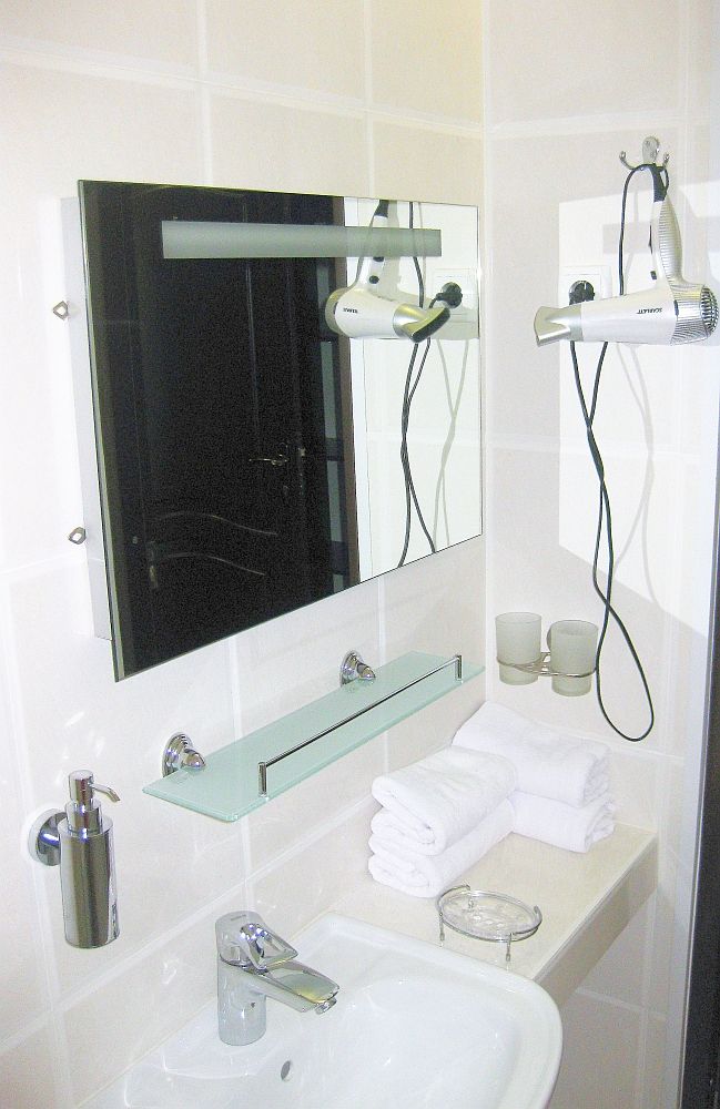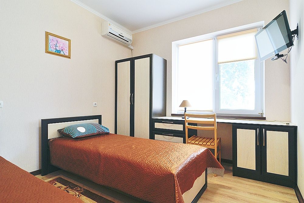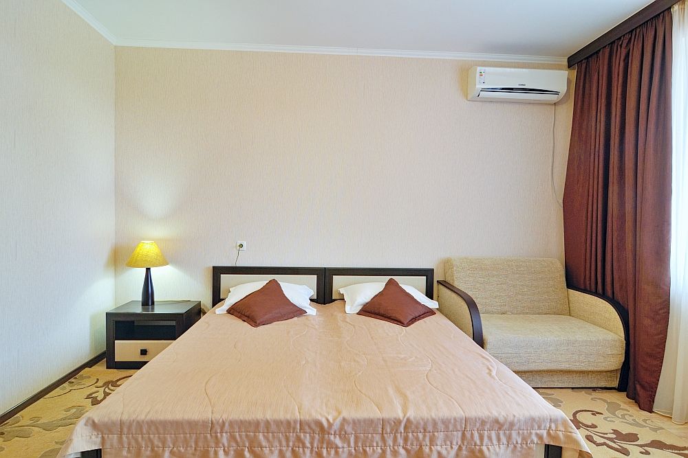 Номера: отель предлагает 2-,3-,4-местные номера, часть номеров - 2-х комнатные. В каждом номере санузел, горячая и холодная вода постоянно. Номера оборудованы кондиционерами и сплит-системами (1-й, 3-й и 5-й корпуса). Во всех номерах спутниковое Т/В, холодильники, э/чайники. Все номера изолированы, меблированы, большинство с видом на море. Кровати комплектуются жесткими матрацами, ежедневно проводится влажная уборка. Двухкомнатные номера расположены в новых отдельностоящих корпусах № 1,2,3,5. В каждом номере раздельный санузел (во 2-ом корпусе совмещен), собственная лоджия. Все 2-х комнатные номера с видом на море.