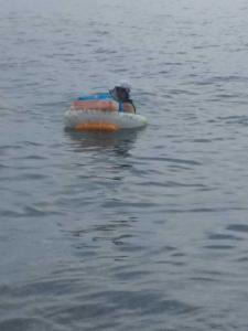 Ребенок встает ногами внутрь, чуть по пояс заходит в море, укладывает руку, ложится на спинку и плавает. Рядом со мной до буйков спокойно. За 14 дней ни одна капля воды не попала в корытце.