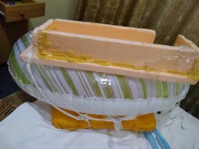 6. Корытце крепилось на большое колесо для плавания и вниз под колесо для гарантии надутая подушечка (такие кладут под голову или на них плавают)