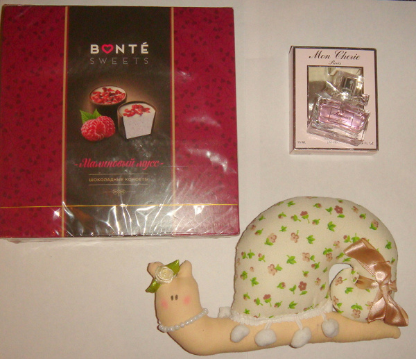 Вот это дар! Ну в этот раз ты меня прям наповал сразила! )) Нежнейшая Улитка, наивкуснейший парфюм и конфеты малииииновые… ))) Не могу удержаться и жутко хочу пожелать почтой себе в подарок на рождение малыша. Но конфеты расстают… Эх! (((