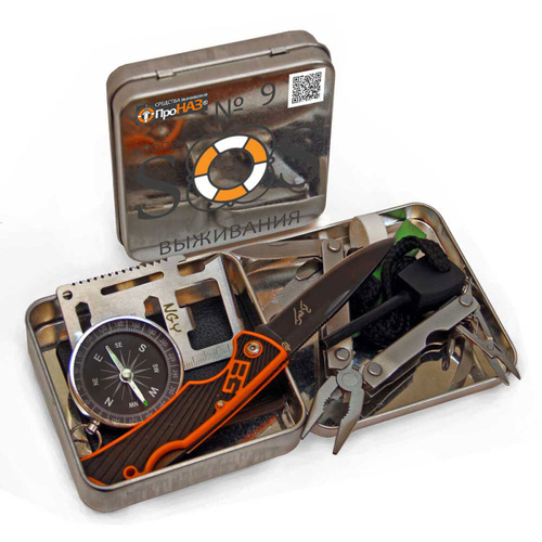 Набор оснащен самыми необходимыми вещами. Это маленький складной нож, свеча, спички, свисток, компас, ловушка и трос. Все предметы имеют высокую степень надежности и не подведут в трудную минуту. Они помогут организовать бытовую сторону жизнеобеспечения при любых негативных обстоятельствах.