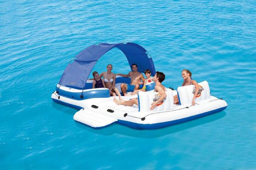 А такой вот огромный многоместный надувной плот можно припарковать в огромном бассейне или возле берега на речке. У него есть тент от солнца и отделение для льда охлаждать напитки. Ценник, безусловно кусается, но если вам нужно что-то бескомпромиссно большое, способное вместить всю кампанию, то это для вас.