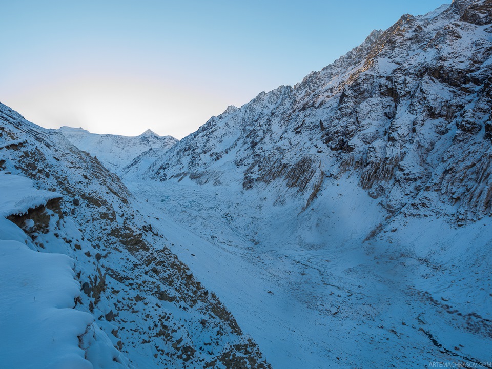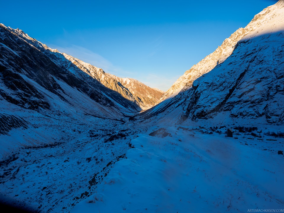 Конец ущелья — конец игры. Альплагерь Безенги. Вместо сражения с боссом — кое-что посложнее, а именно — гора хычинов размером с пирамиду Хеопса. Пришлось ввести секретный чит-код. Через побег в синюю кабинку я прошел на бонусный уровень. Полчаса, запыхаясь, карабкался в гору по колено в снегу, чтобы оказаться здесь. Безенгийская стена и ледник. Не буду говорить, что во всей красе, так как солнце над практически зашло. Но оказавшись здесь, понимаешь, что все было не напрасно.